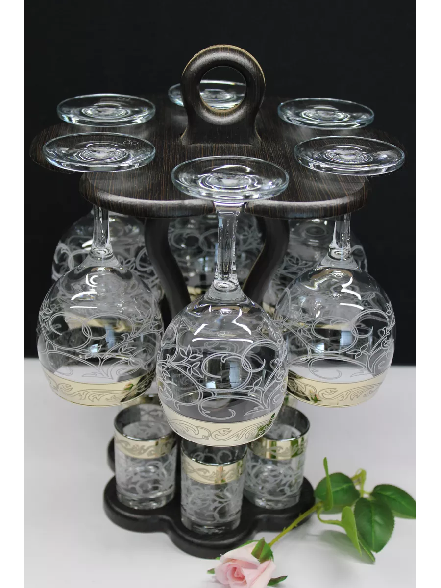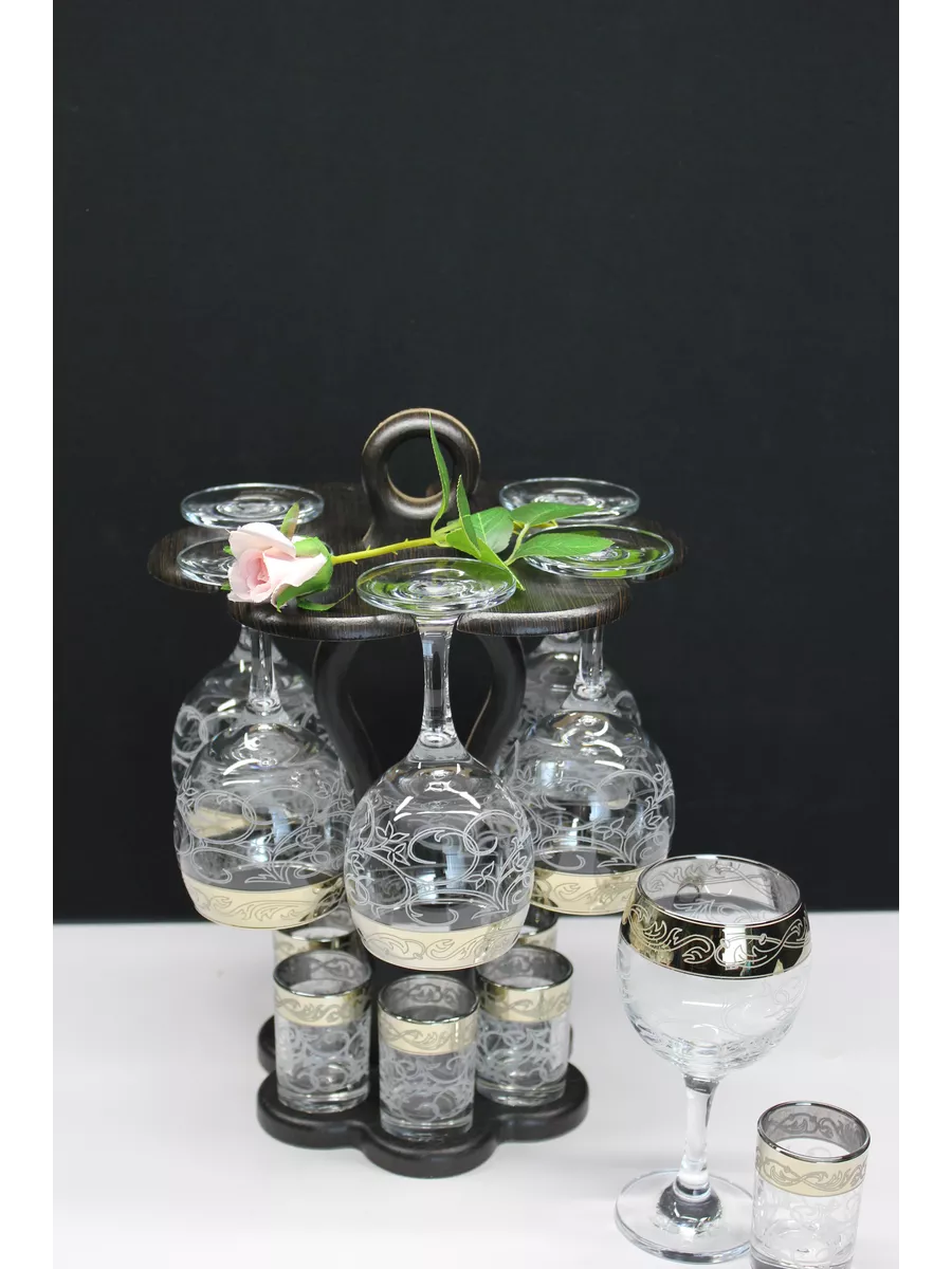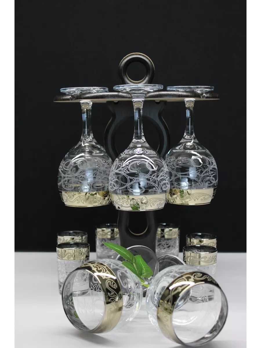 Барный набор 12 предметов из 6 фужеров 6 стопок с гравировкой и золотым напылением на барной стойке из МДФ - это не только функциональная вещь, но и настоящий предмет искусства, который будет радовать глаз и душу на многие годы. Закажите сейчас и наслаждайтесь настоящими напитками в стильном и роскошном дизайне!