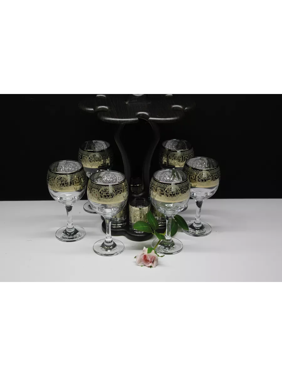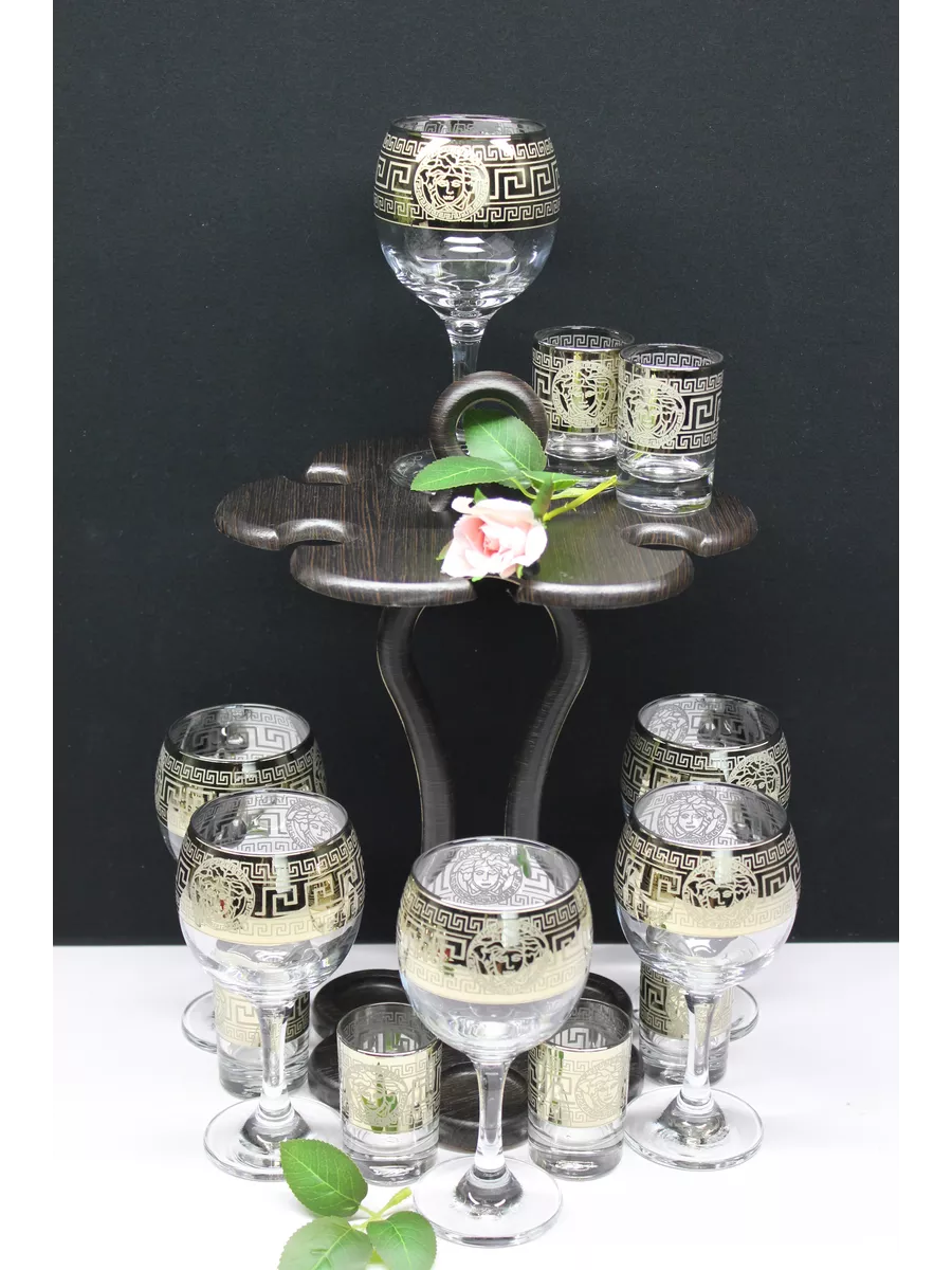 Этот стильный барный набор включает в себя 12 предметов, среди которых 6 фужеров и 6 стопок, украшенных гравировкой в стиле версаче и золотым напылением, расположенных на барной стойке из МДФ. Набор изготовлен из высококачественного стекла и МДФ, которые прочны и легко очищаются. Фужеры имеют удобную форму, которая позволяет легко наливать напиток, а их объем позволяет насладиться полной меркой напитка. Стопки идеальны для разлива других напитков и смешивания коктейлей.