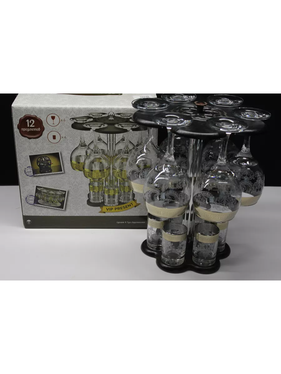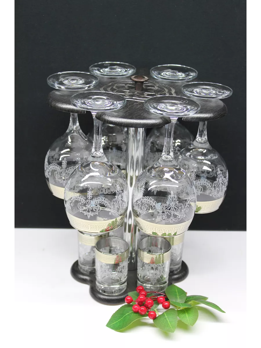 Барный набор 12 предметов из 6 фужеров 6 стопок с гравировкой и золотым напылением на барной стойке из МДФ - это не только функциональная вещь, но и настоящий предмет искусства, который будет радовать глаз и душу на многие годы. Закажите сейчас и наслаждайтесь настоящими напитками в стильном и роскошном дизайне!