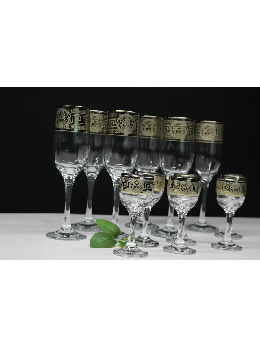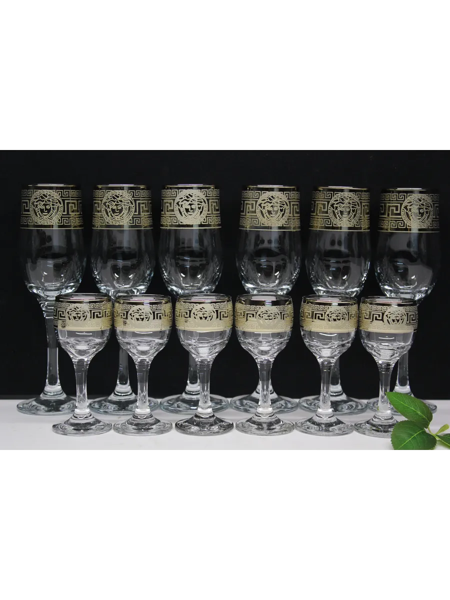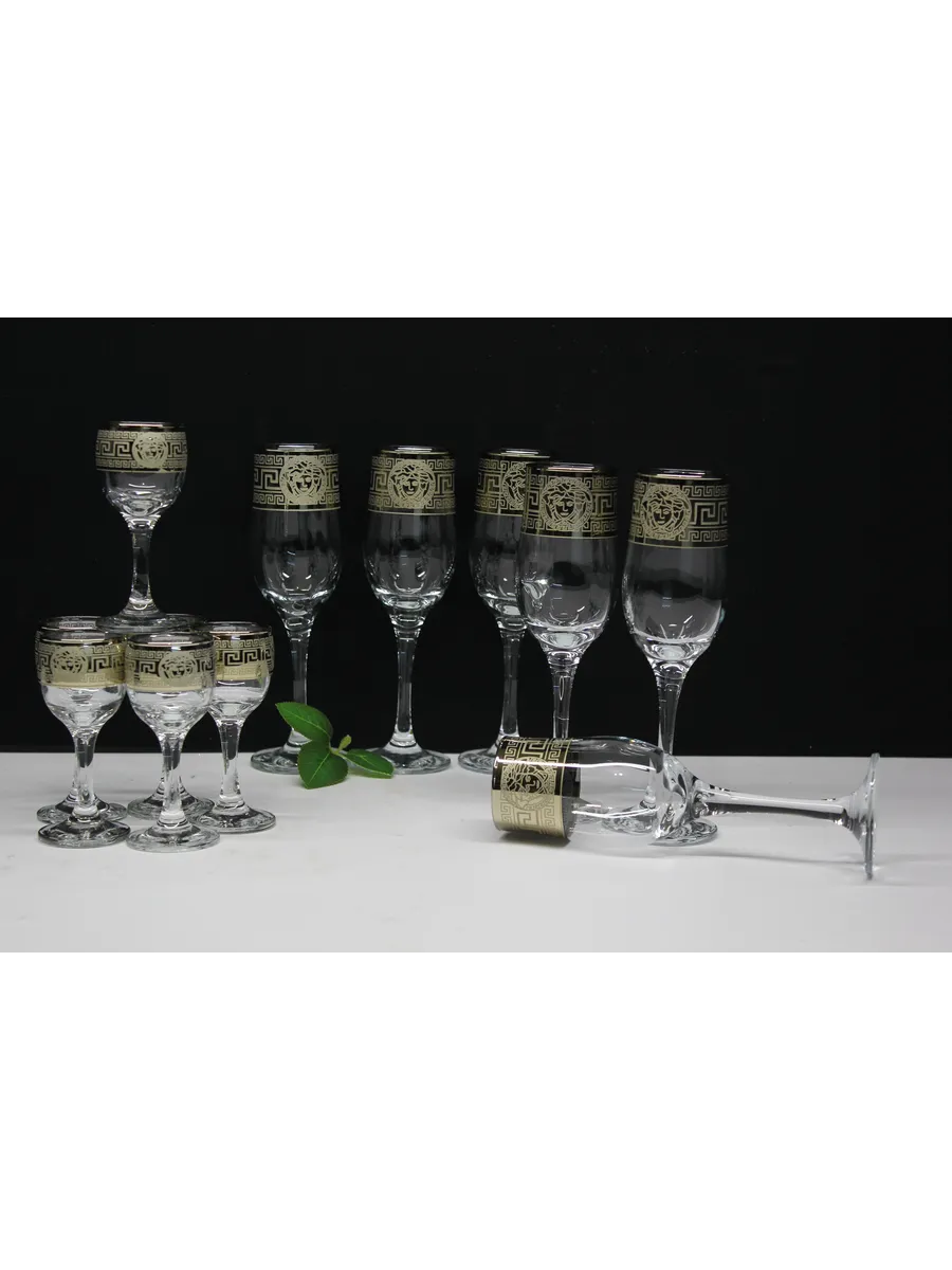 Этот роскошный подарочный набор — идеальный выбор для особых случаев и незабываемых моментов. В набор входят 6 элегантных бокалов и 6 изысканных рюмок, украшенных гравировкой в стиле Версаче и золотым напылением, что придает им особый шик и утонченность.