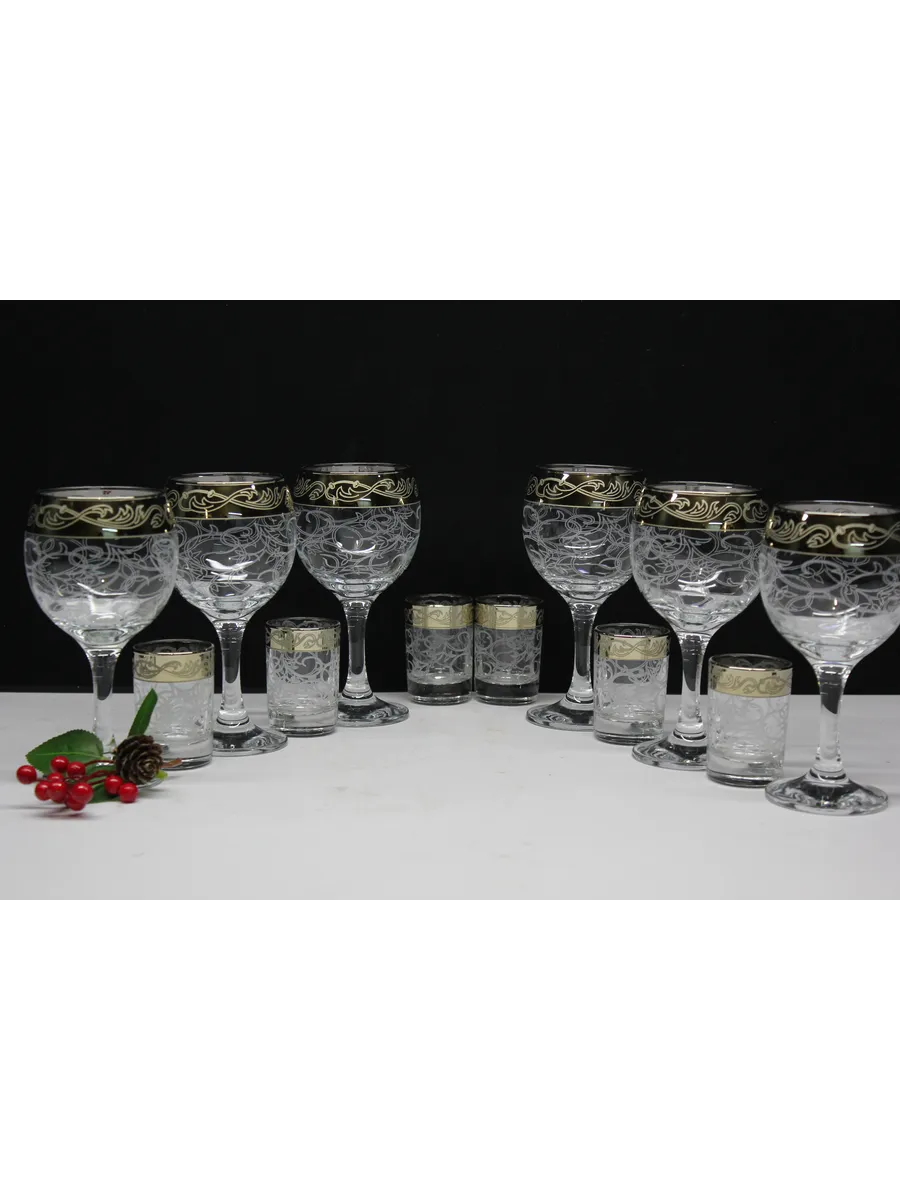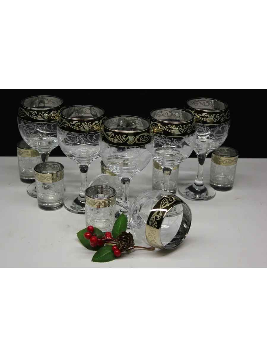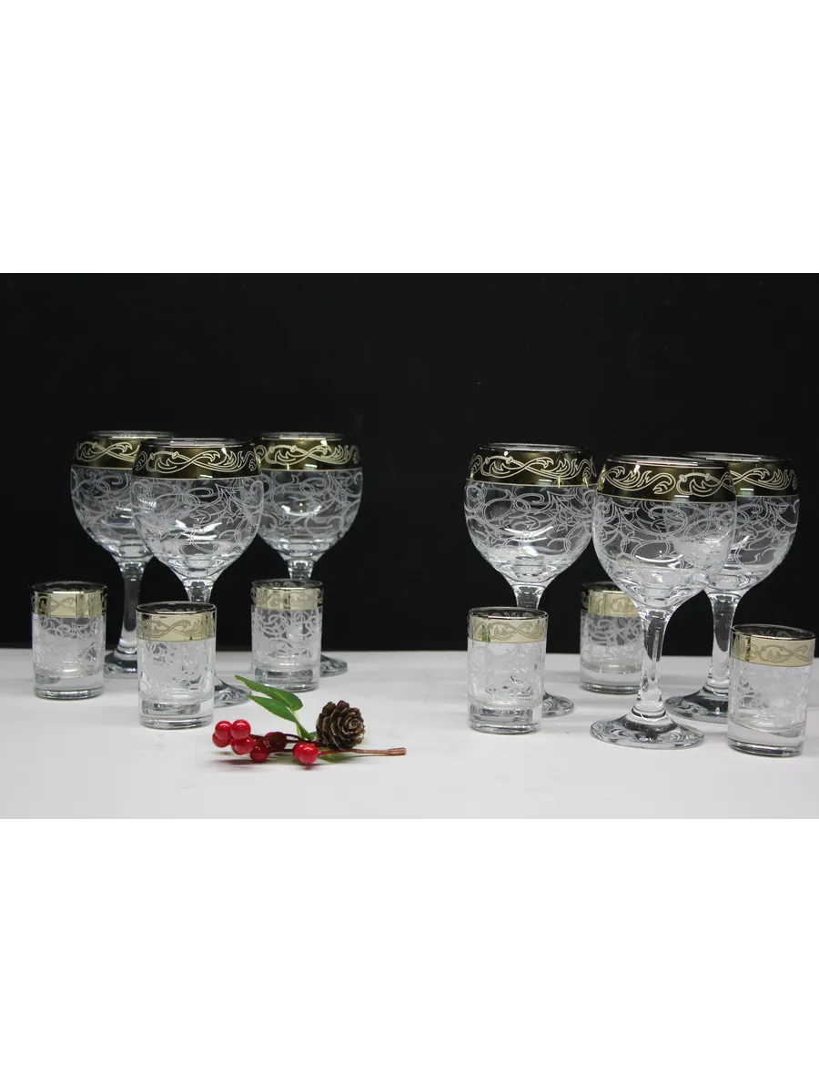 Золотое напыление: Элегантное золотое напыление на краях фужеров и стопок придает им роскошный вид и делает их центром внимания на любом столе.